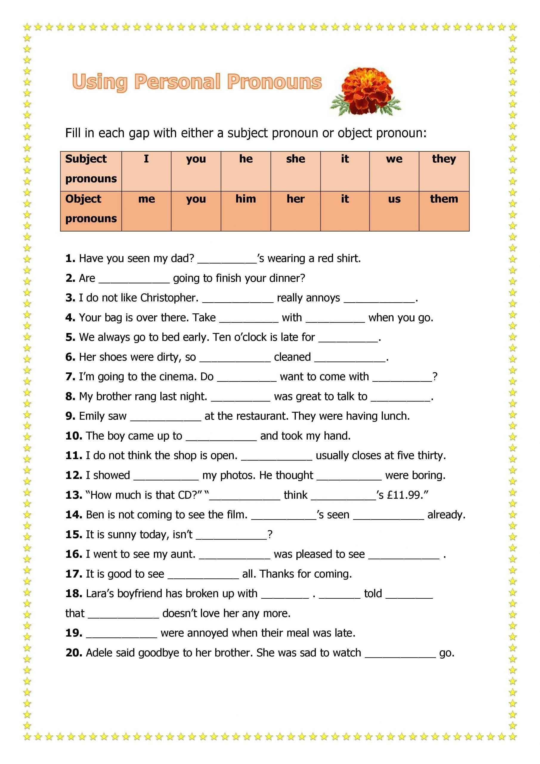 1. Start with the basics: Before diving into the worksheet, it is important to learn the basics of the subject pronoun. Make sure to learn the different forms of each pronoun, such as singular and plural, as well as the gender of each pronoun. This understanding of the basics will make it easier to understand the worksheet.