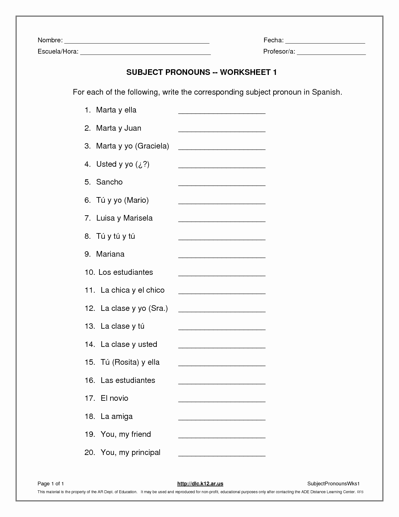 2. Practice with examples: Try to identify the subject pronouns in sentences or phrases. This will help you to understand the context of the worksheet. Additionally, practice writing sentences using the subject pronouns to ensure you are comfortable with their usage.