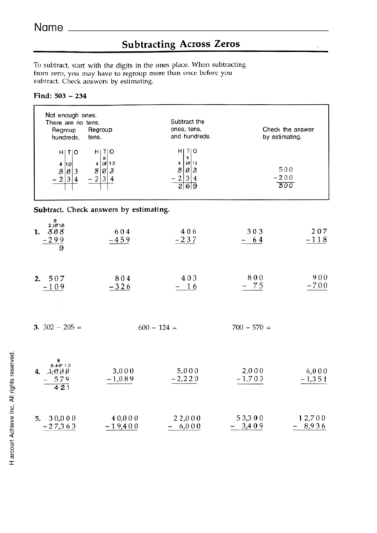 Subtracting Across Zeros Worksheet With Answer Key Printable Pdf Download Within Subtracting Across Zeros Worksheet