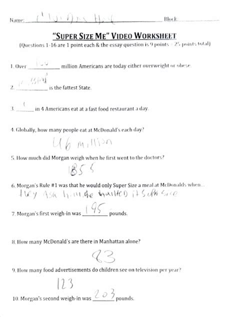 Finally, the Super Size Me Worksheet Answers indicate that the diet can lead to an increased risk of depression and other mental health issues. This is because fast food is often high in calories and fat, and can lead to an increase in stress levels. Additionally, fast food meals often lack essential vitamins and minerals, which can lead to deficiencies in essential nutrients.