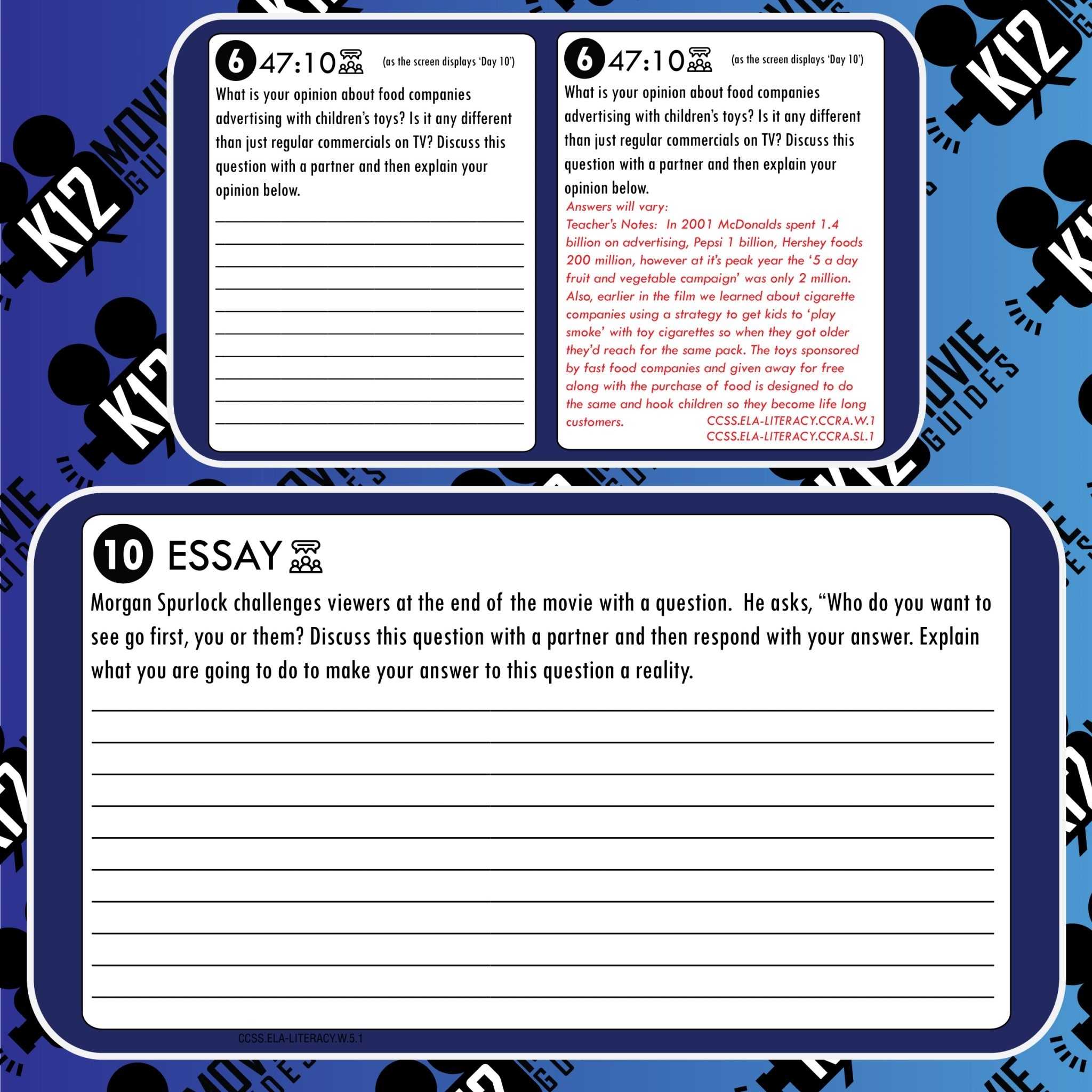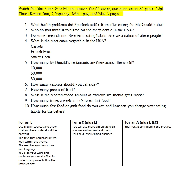 The Super Size Me worksheet, which was distributed to accompany the documentary, asks viewers to answer a series of questions about their own dietary habits and their attitudes towards the Super Size Me diet. The questions assess the viewers’ understanding of the risks posed by consuming large amounts of fast food, and their opinion on its role in society.