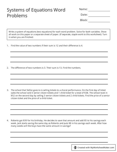 By following these steps, educators can create an effective systems word problems worksheet that will help students understand the concepts being taught. It is important to ensure that the worksheet is designed to challenge students and promote critical thinking.