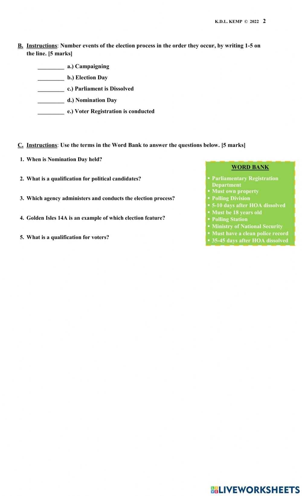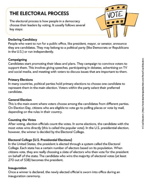 The Electoral Process Worksheet provides a comprehensive overview of the various steps in the electoral process. It is a valuable tool for understanding how our democracy works and how we can participate in the political process. By understanding the various steps, we can better understand the importance of voting, how our votes are counted, and how our representatives are chosen. This worksheet also serves as a reminder of the power of the people to shape the future of our nation.