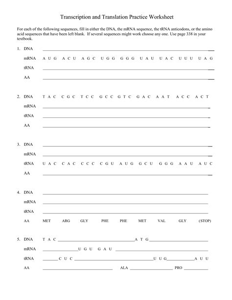 Finally, the fifth step is to apply the concepts and processes learned through the practice worksheet. Students should attempt to solve problems that involve transcription and translation. This will help to reinforce the concepts and processes and ensure that they are fully understood.