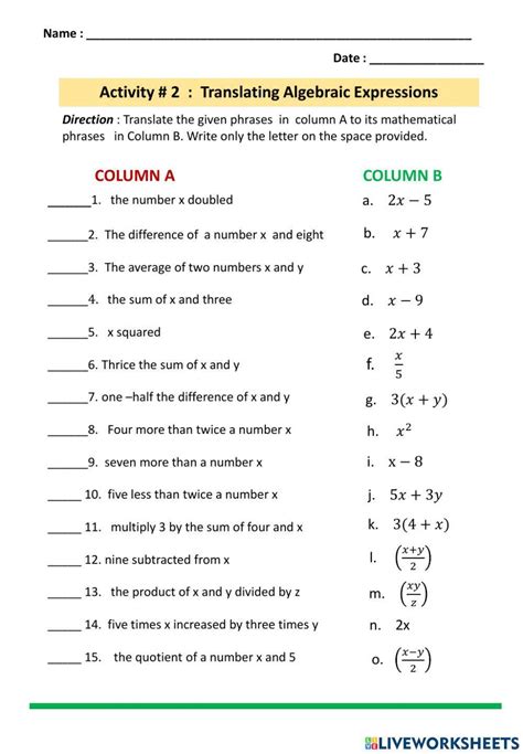 Using a translating algebraic expressions worksheet is an effective way to improve mathematical skills. Translating algebraic expressions is a critical skill for working with algebraic equations, and a translating algebraic expressions worksheet can help students build their understanding of this concept.
