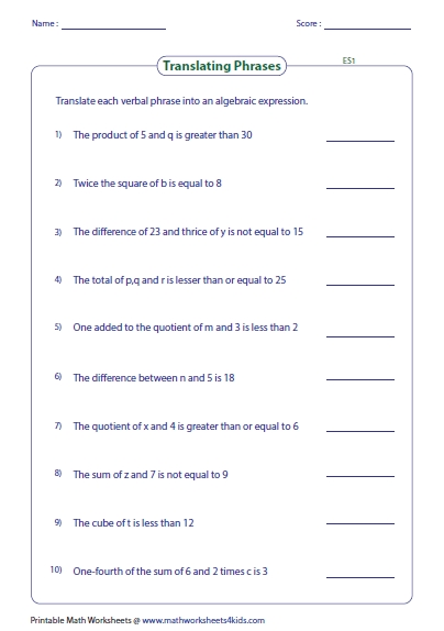 Using a translating algebraic expressions worksheet can also help students practice using the different types of operations they may encounter. This includes subtractions, divisions, multiplications, and squares. When students practice these operations, they are better able to apply them to real-world problems.