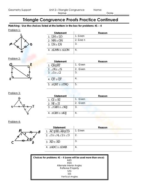 By following these steps, you can create a comprehensive triangle congruence proof worksheet that will help your students practice their proof-writing skills. By providing detailed explanations and challenging proof problems, your students will be well-prepared to tackle any future proof problems.