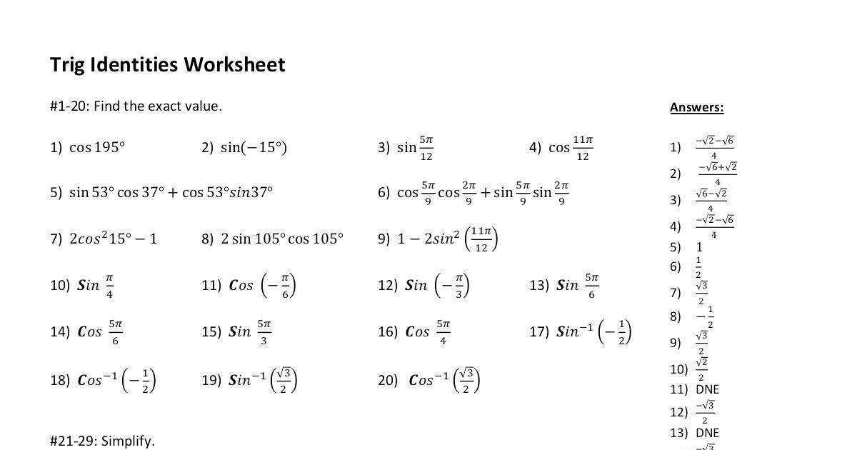 Trig Identities Worksheet With Answers