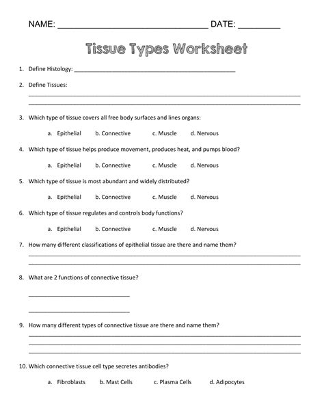 The human body is made up of several different types of tissues that serve different functions. In order to better understand the unique roles of each tissue type, it is helpful to create a worksheet that outlines the various tissues and their functions. This worksheet will help students learn more about the different types of tissues and their respective functions.