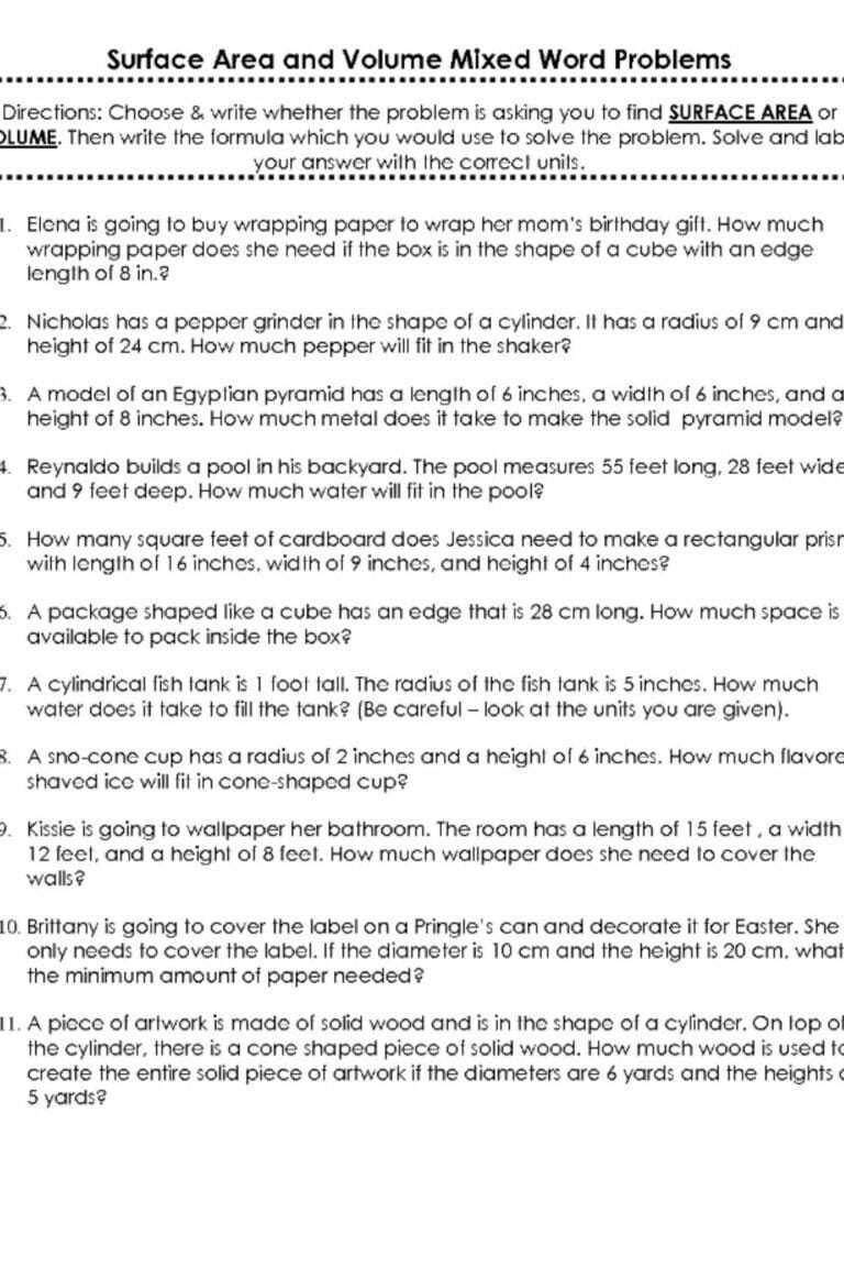 In addition to providing practice with the volume formula, a volume word problems worksheet can also include practice with other related topics. This could include the use of diagrams to represent three-dimensional objects, or other problems related to surface area. By providing students with a variety of problems to work on, they can gain a greater understanding of the concept of volume and its related topics.