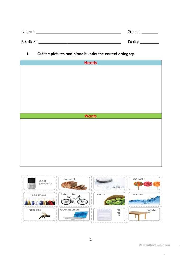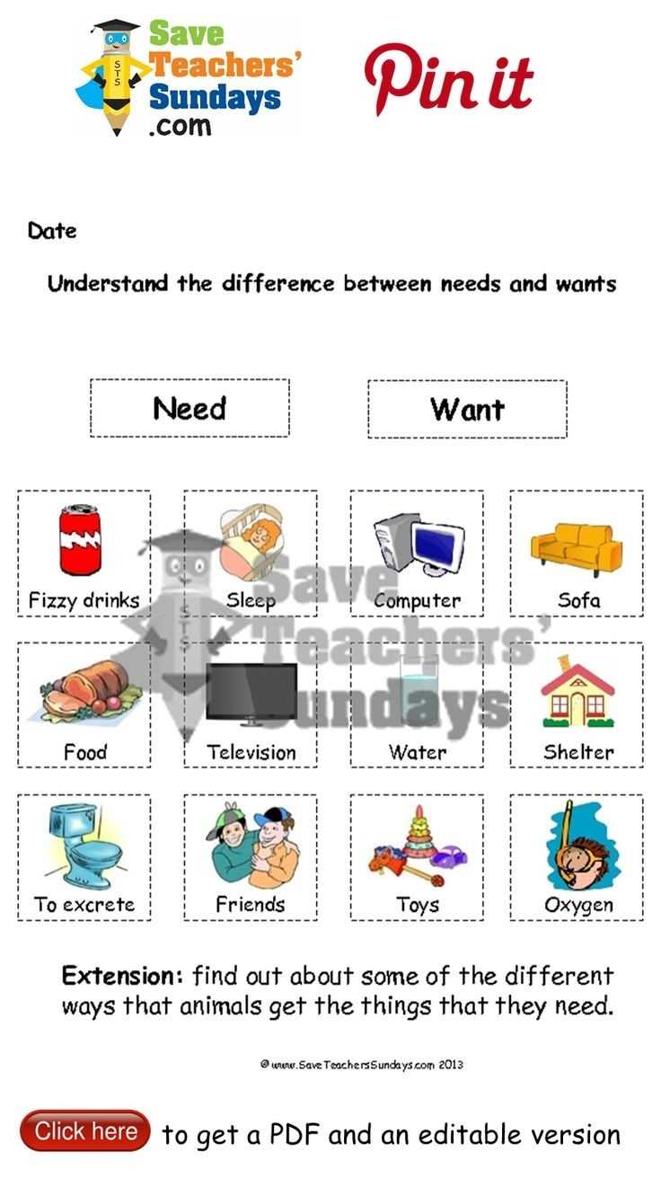 To use the worksheet, parents should first explain to their children the difference between needs and wants. Needs are items that are essential for survival and include items such as food, shelter, and clothing. Wants, on the other hand, are items that are not essential but may bring pleasure to the person. These can include items such as video games, toys, and electronics.