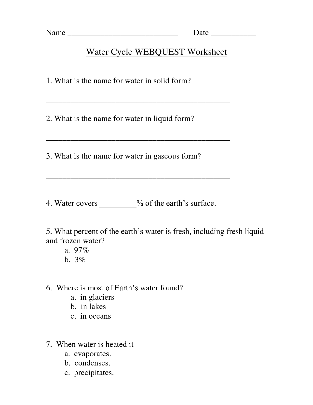 Content: The content of the worksheet should be accurate and relevant to the topics and concepts being taught in the classroom. It should also be age-appropriate, containing information that is suitable for middle school students, including facts and diagrams to help students understand the water cycle.