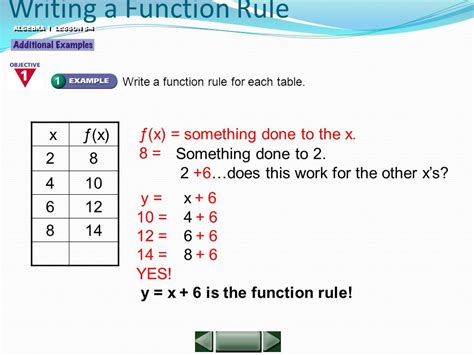 7. End the lesson with a review of what was learned and ask students to provide some examples of the function rules that they have created.